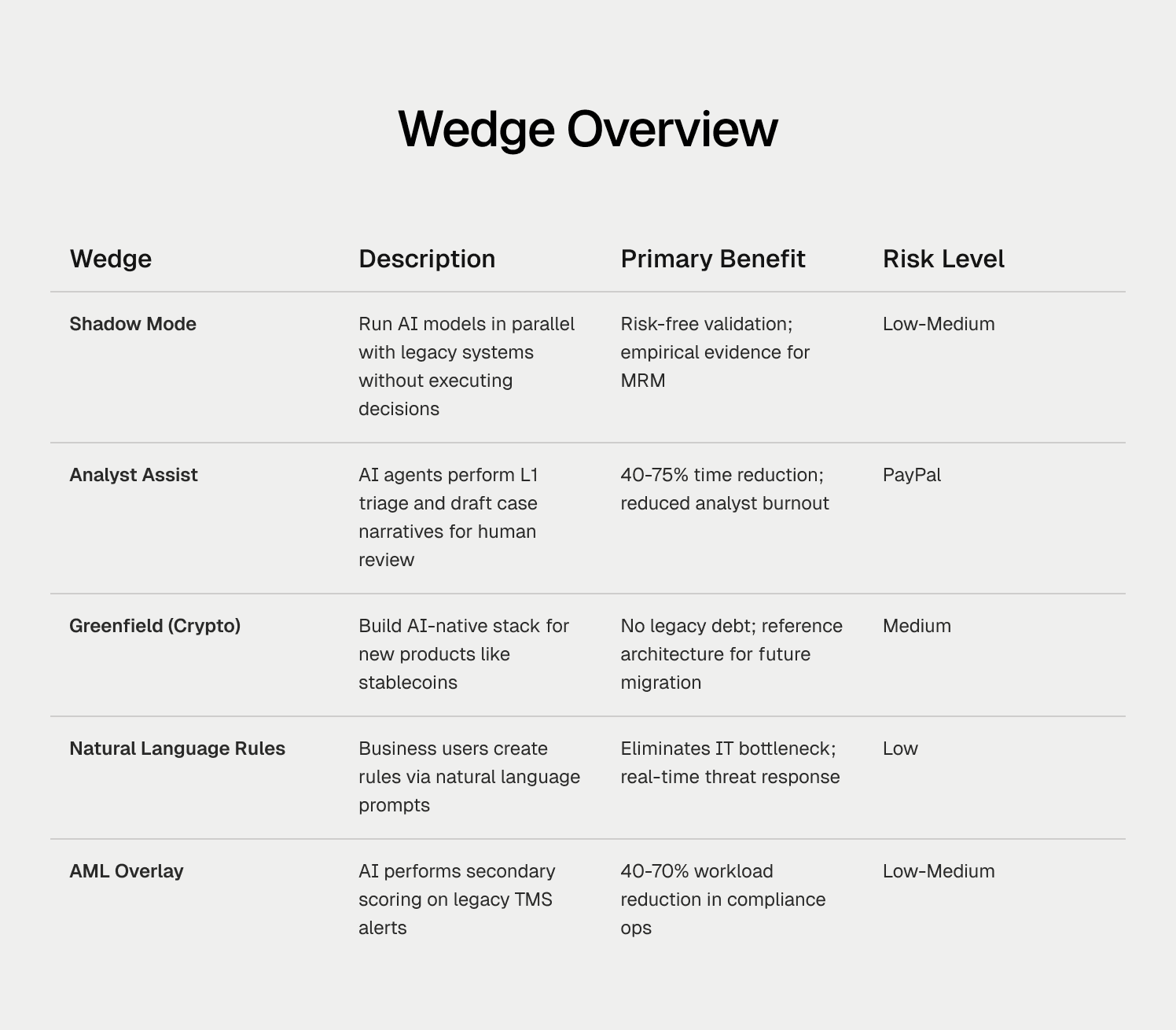 McKinsey’s AI Bank of the Future framework correctly identifies the architectural end state; the wedges outlined here show how banks can reach that state pragmatically — without halting operations or surrendering control of decisioning logic. Banks can overlay intelligent, agentic infrastructure on top of legacy cores today. Start with shadow mode to prove safety. Deploy analyst-assist agents to relieve immediate operational pressure. Seize greenfield opportunities like stablecoins to build cloud-native risk stacks from the ground up.